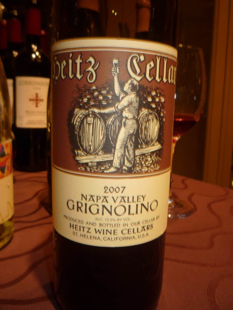 We then moved into the line-up of reds. Our first wine was also from the same region as the aperitif that began the tasting. The 08 Gorrondona, Hondarribi Beltz, Aldape Vineyard, Bizkaiko Txakolina was earthy with almost a silt taste. It was a tart fizzy wine. You could taste the red fruits and it paired well with the goat cheese on the lovely cheese tray provided by Chef Andre Natera. I am a big fan of Heitz reds, so I was eagerly anticipating trying the 07 Heitz, Grignolino, Napa Valley. What a change from the big, bold flavors that I was used to in Heitz wines. This was much more subtle with orange notes, rose petals and berries.