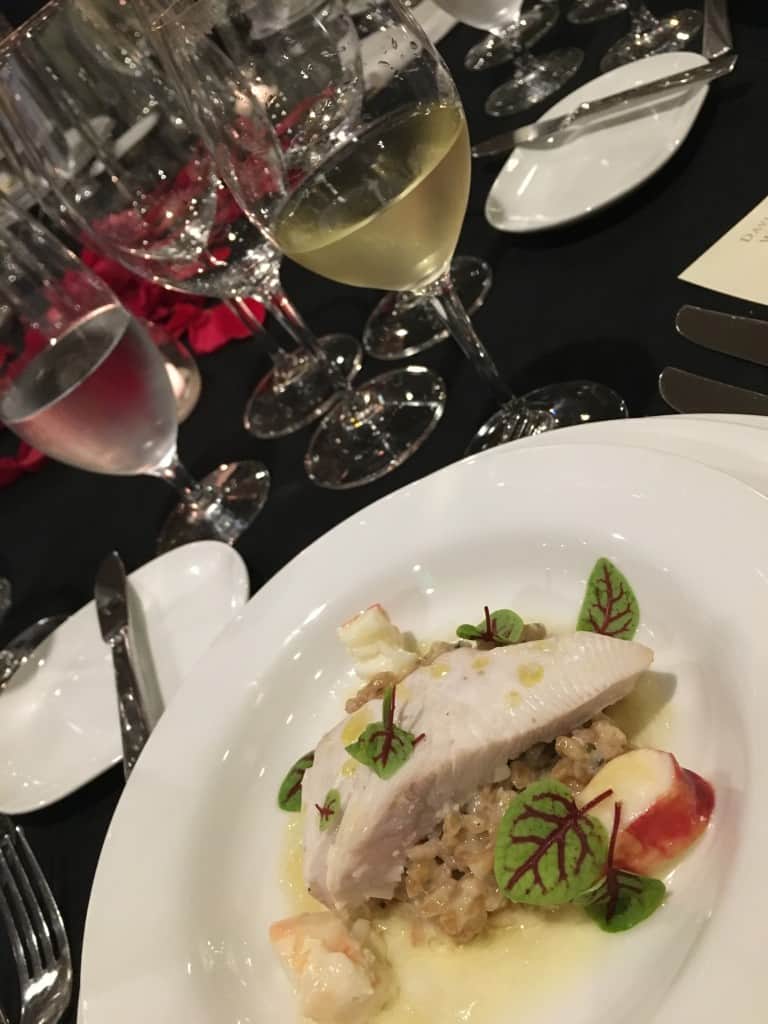 Course one – Steamed wild Hawaiian caught manchong with king crab, matsutake farro risotto, preserved lemon, brown butter, lemon, red ribbon sorrel with the 2013 David Arthur Vineyards Chardonnay.