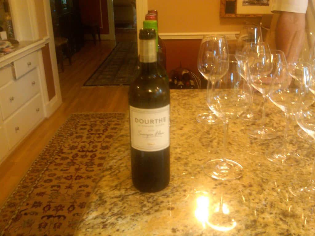 I secured the cheeses and various appetizery things and set up the glasses. Our first wine was a Dourthe Grand Cuvee Sauvignon Blanc 2010. Dourthe, a Bordeaux negociant, also owns several other interesting properties including Haut-Medoc’s fifth growth estate, Belgrave, and the St Estephe cru bourgeois property St Estephe cru bourgeois. This wine was full of lemon and grapefruit and lots of fruitiness. It was fresh, crisp and a great summer wine for $12.